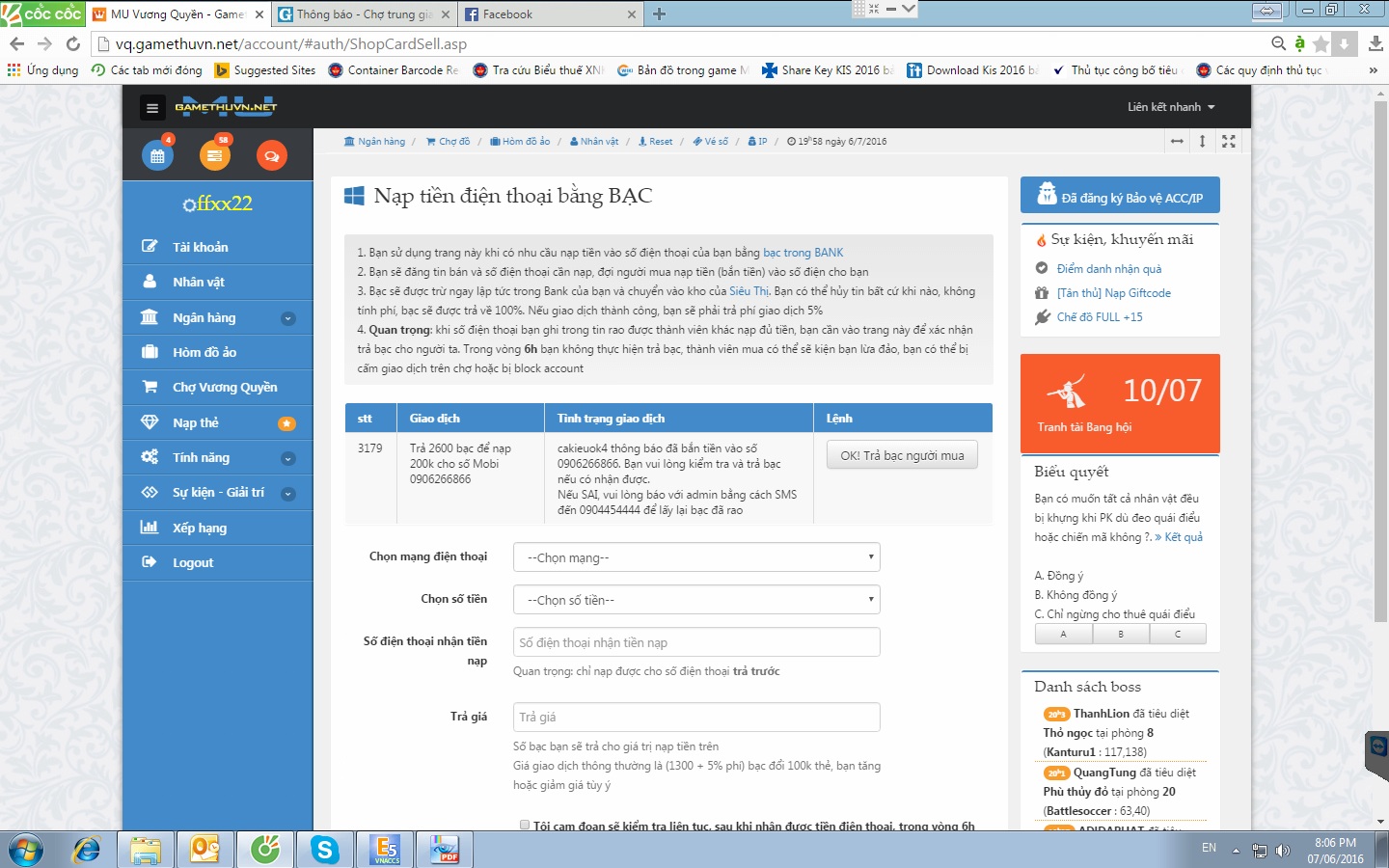 Tài khoản ffxx22 giao bán 2600 bạc lấy thẻ 200k mobiphone số 0906266866, nick cakieuok4 nhận mua và báo đã gửi thẻ, nhưng tôi ko nhận đc tiền.