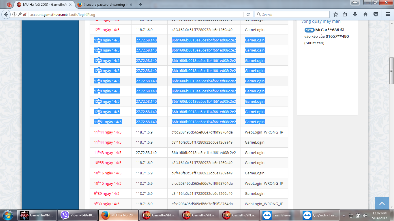 Gửi @fantasymc , @Thiên Thanh Hi BQT MUHN. Hôm nay 14/05/2017, account: EndGame, nhân vật: TheEnd SĐT đăng ký: 004 ***** 568 Có hủy ip lúc 7h45', đổi mật khẩu cấp 1 riêng lúc khoảng 8h00' (Em hủy ip để tiện đua G, nếu bận nhờ ae chạy tiếp hộ để có logo 35%). Lúc này mật khẩu cấp 1 chỉ mình em sử dụng, cam đoan không chia sẻ bất kỳ ai từ lúc đổi mật khẩu cấp 1 đến hiện tại. Đến 12h00' có người đăng nhập kick tài khoản ra, sau đó em kick lại luôn vào game đã bị IP: 27.72.58.140 lấy mất đồ: Pedan sét +11 full... Sau đó thì một số account như của chủ top cũng bị mò pass vào lấy đồ, IP này đã rất nhiều lần mò được tài khoản game của mọi người. Em không mong lấy lại được đồ, xin BQT trừng trị tìm kẻ gian block vĩnh viễn ạ.