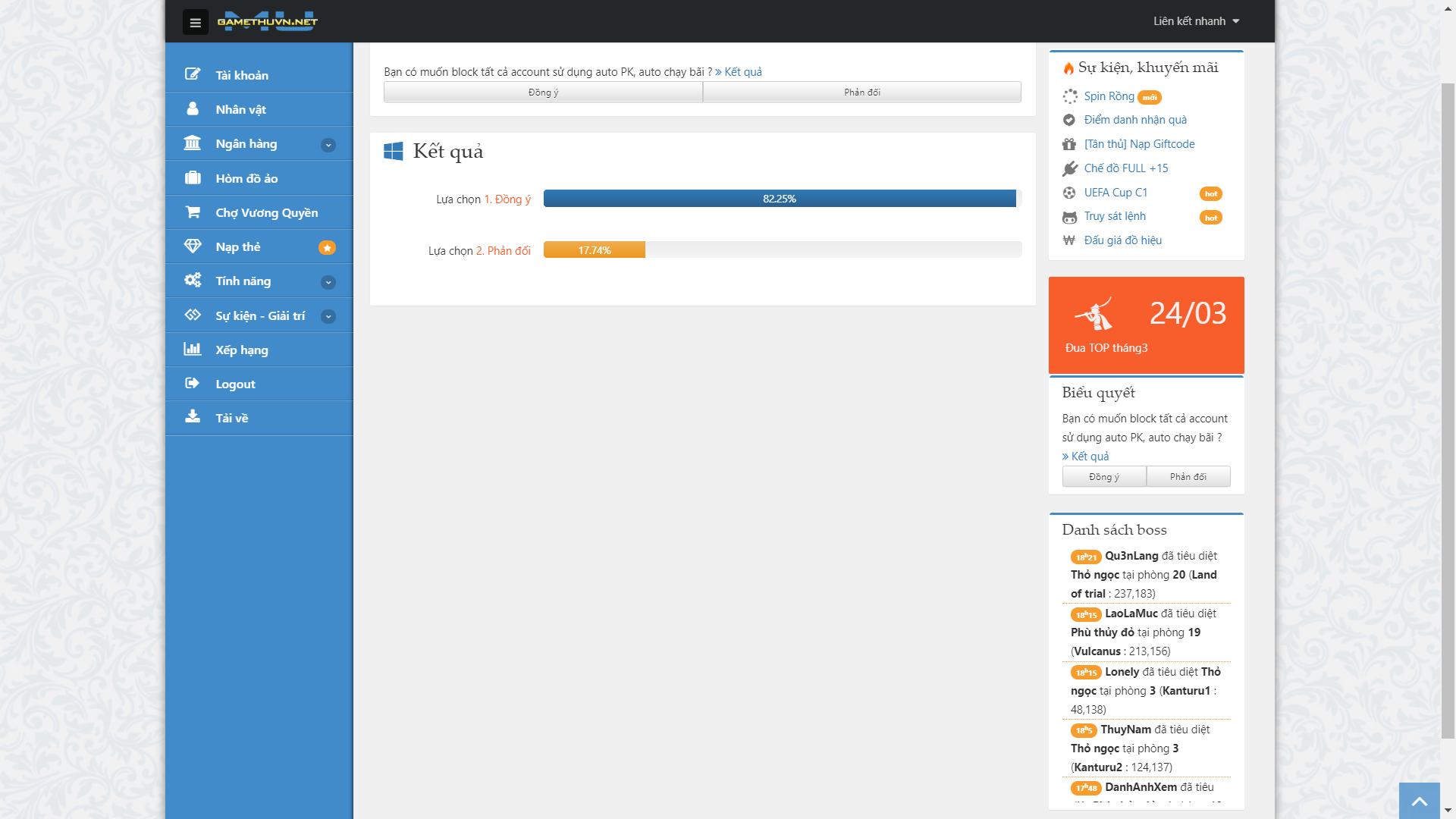 MÌNH KHÔNG TỐ CÁO VÀ MÌNH LÊN ÁN NẠN AUTO ( GHI RÕ Ở ĐẦU TOPIC ) CÒN CHÍNH XÁC ACC NÀO DÙNG AUTO ADMIN ĐÃ NẮM ĐƯỢC PHẦN NÀO RỒI. CHÍNH ADMIN ĐÃ MỞ CÁI PHIẾU BẦU ĐÓ LUÔN RỒI THÌ MONG NGÀY XỬ LÍ THÔI. HIỆN TẠI AUTO TRÀN LAN QUÁ NHIỀU ACC DÙNG NÊN NẾU ADMIN CÓ XỬ LÍ THÌ MÌNH CÓ Ý NÀY. THÔNG BÁO BLOCK BẤT CỨ ACC NÀO DÙNG AUTO ( CHO THỜI GIÀN 1 HOẶC 3 NGÀY ĐỂ "DỌN DEP" ) SAU ĐÓ THÌ SỐ LƯỢNG SẼ GIẢM ĐÁNG KỂ RỒI LÚC ĐÓ CỤ THỂ ACC NÀO AUTO MÌNH LÀM LUÔN CLIP SIÊU RÕ CHO, CÒN GIỜ THÌ QUÁ NHIỀU RỒI. THÂN