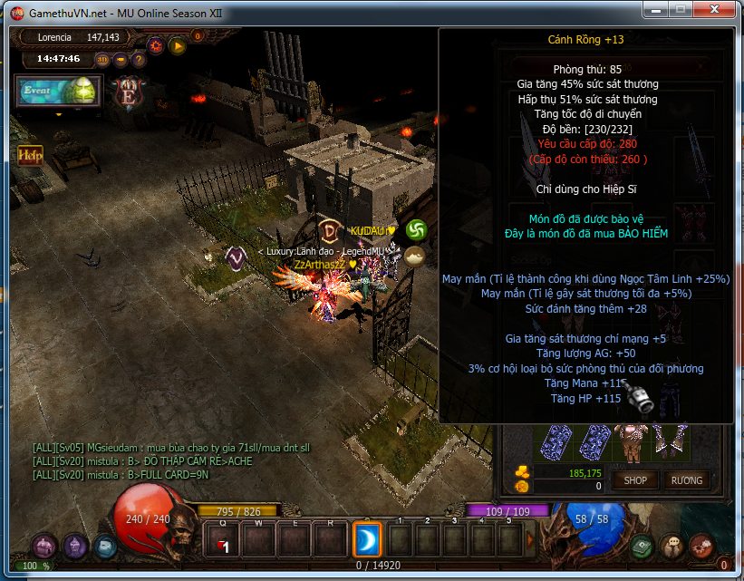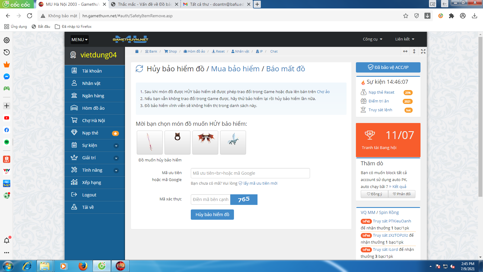 1. Anh (em) cho mình hỏi mình chơi từ ngày xưa có mấy đồ bảo hiểm (Wing2 DK full, 1 số đồ DL) không hiểu sao bây giờ chơi lại không hủy được bảo hiểm đồ vậy? Thanks AE!