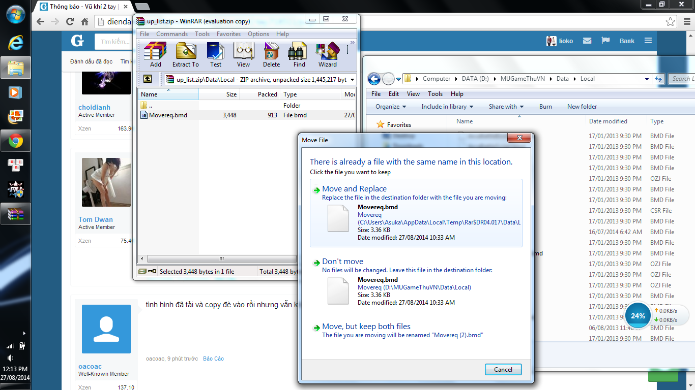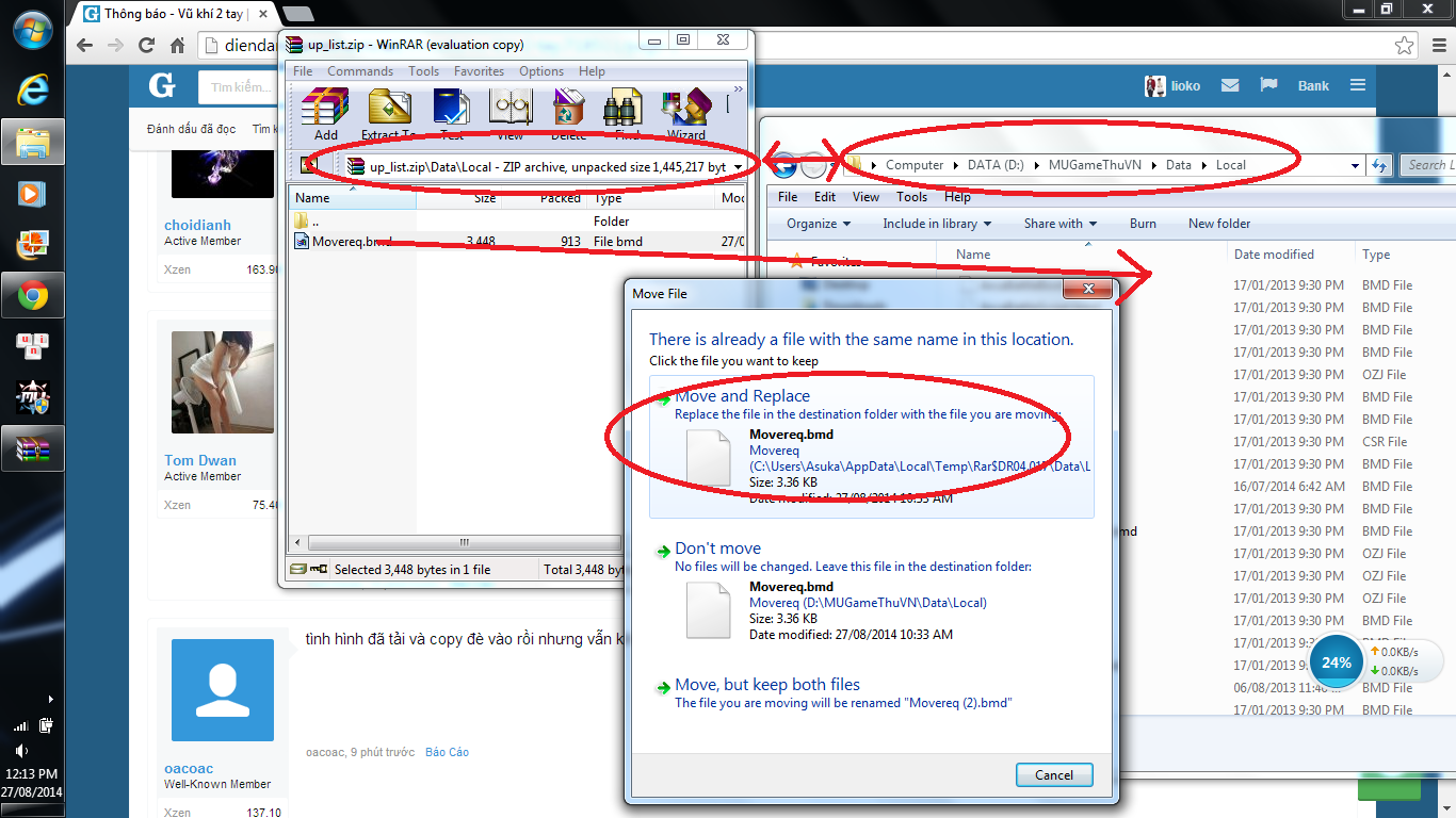 Đây là win 7 bật 2 thư mục lên rồi kéo thả đúng thư mục cần bỏ nhé, có trật tự ở trong file zip đấy và chọn move and replace